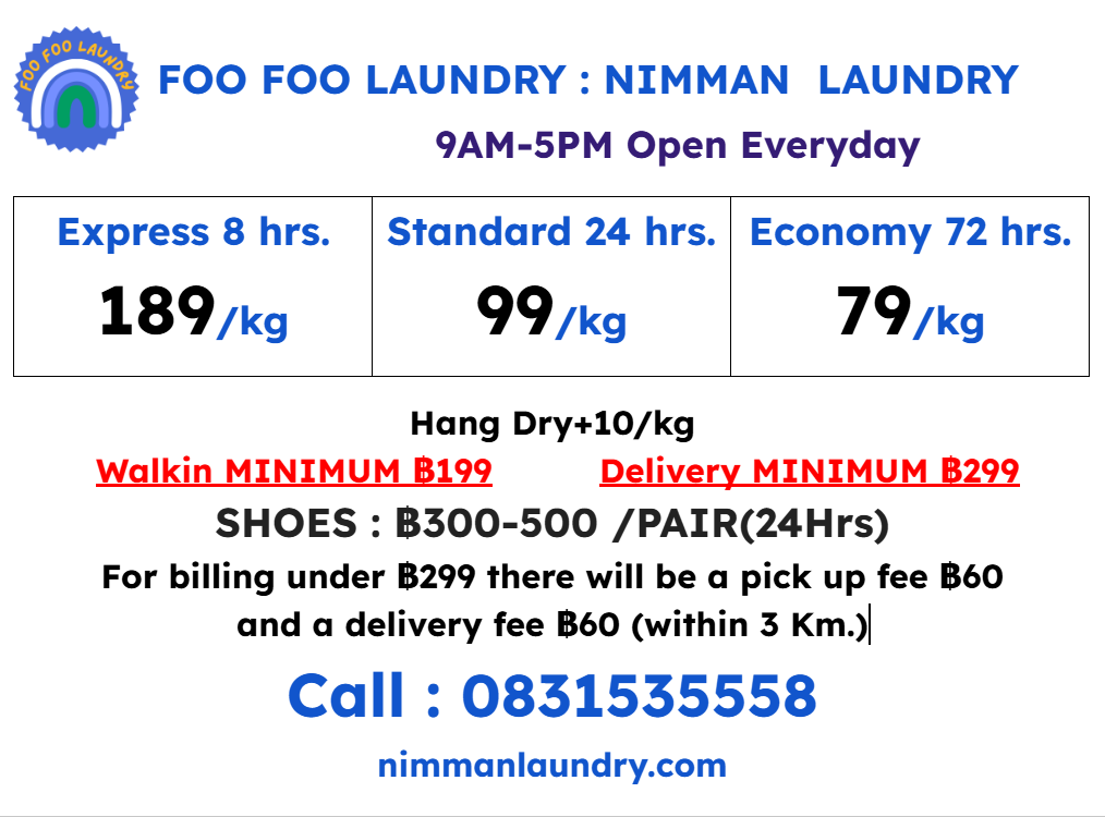 您正在寻找方便且高质量的洗衣服务吗?位于清迈的“尼曼洗衣店”为您提供可靠的洗衣服务。我们不仅提供一流的洗衣服务,还为清迈地区提供免费取送服务。